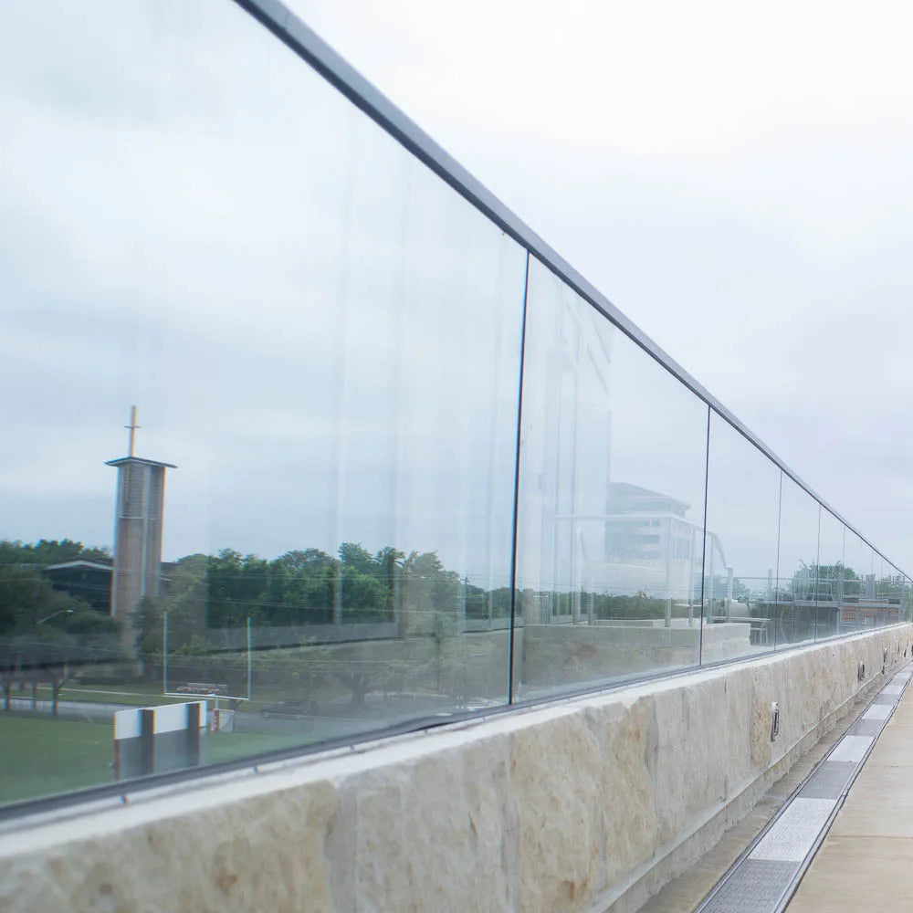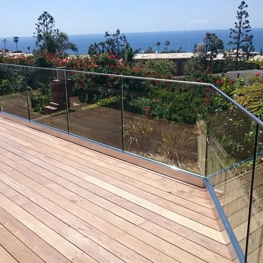 This kind of railing uses aluminum bottom channel shoe to hold the glass, instead of standing post. In this way, it brings not only simple and modern appearance but also strong and durable quality. There are no posts betweeen glass, which makes the maximum area of glass and brings better view.