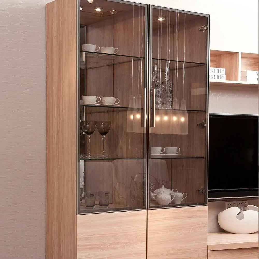 With its simple shape and modern design, aluminum frame glass door can be widely used on wardrobe, kitchen cabinet, TV cabinet, bathroom vanity, wine cabinet, bookcase and so on.